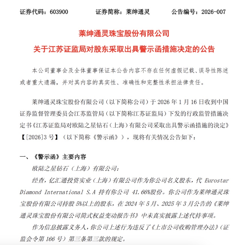 1月16日晚,莱绅通灵发布公告称,公司当日收到《江苏证监局对欧陆之星钻石(上海)有限公司采取出具警示函措施的决定》(简称“《警示函》”),欧陆之星钻石(上海)有限公司(简称“欧陆之星”)因未如实披露相关股东代持事项,违反了《上市公司收购管理办法》相关规定。
