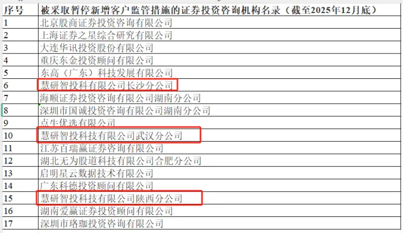 回顾刚刚过去的2025年,慧研智投便已多次“上榜”:其武汉、广州、陕西等多家分公司先后因违规行为被属地证监局责令改正。在证监会2026年1月9日更新的《被采取暂停新增客户监管措施的证券投资咨询机构名录》中,全国共有17家投顾机构及其分支被暂停新增客户,而慧研智投旗下长沙分公司、武汉分公司、陕西分公司三家分公司赫然在列。