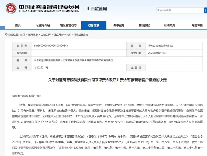 山西证监局开年一号罚单给了投顾机构慧研智投。