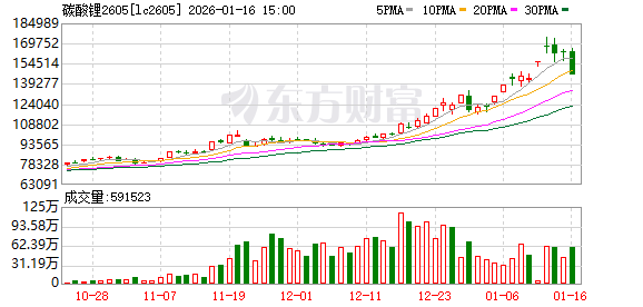 1月16日,碳酸锂期货主力合约LC2605报收14.62万元/吨,单日跌幅达8.99%,触及跌停。而在此之前的1月5日至1月13日,碳酸锂期货主力合约LC2605从12.28万元/吨一路涨至最高17.41万元/吨,创下近两年新高。短短3个交易日后,其价格自高点回落幅度就超过了16%。