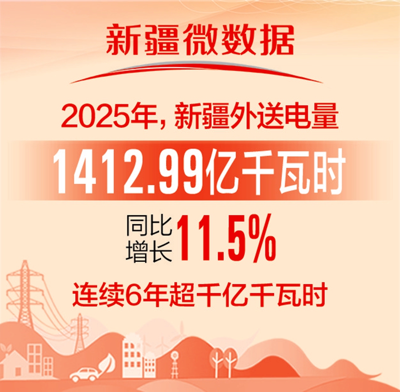 本报乌鲁木齐1月17日讯 石榴云/新疆日报记者陈蔷薇从新疆电力交易中心有限公司获悉:2025年,新疆外送电量1412.99亿千瓦时,同比增长11.5%,连续6年超千亿千瓦时。