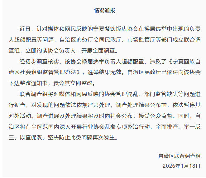 近日,针对媒体和网民反映的宁夏餐饮饭店协会在换届选举中出现的负责人超额配置等问题,自治区商务厅会同民政厅、市场监管厅等部门成立联合调查组,立即约谈协会负责人,开展全面调查。