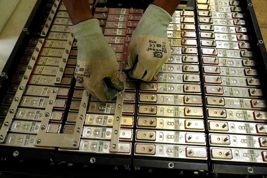 位于印度班加罗尔的一家工厂内,电池生产工程师在组装由废旧电动汽车电池制成的翻新电池组。 (视觉中国)