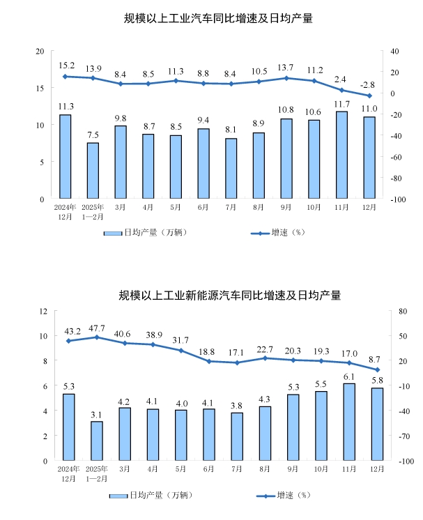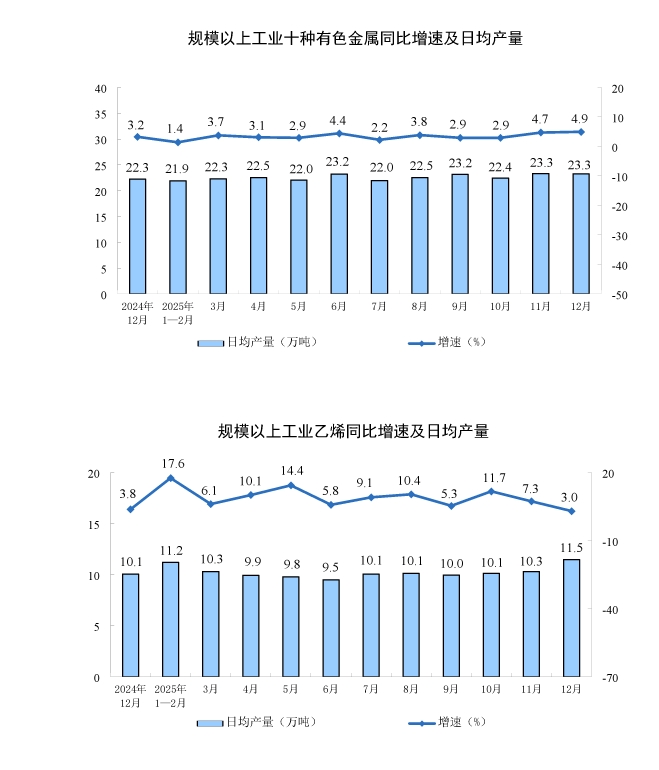 分产品看,12月份,规模以上工业623种产品中有325种产品产量同比增长。其中,钢材11531万吨,同比下降3.8%;水泥14416万吨,下降6.6%;十种有色金属721万吨,增长4.9%;乙烯356万吨,增长3.0%;汽车341.2万辆,下降2.8%,其中新能源汽车179.1万辆,增长8.7%;发电量8586亿千瓦时,增长0.1%;原油加工量6246万吨,增长5.0%。