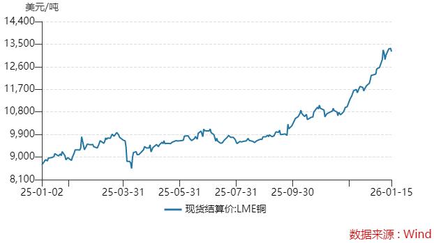 LEM伦铜价格2025年累计上涨近42%,创下16年来的最大年度涨幅。2026年LEM伦铜价格涨势未歇,进一步突破13,300美元/吨。