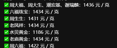 今日各大黄金品牌价格,周生生每克1451元,周大福每克1455元,老凤祥报价每克1456元,老庙黄金每克1459元,潮宏基每克1455元。