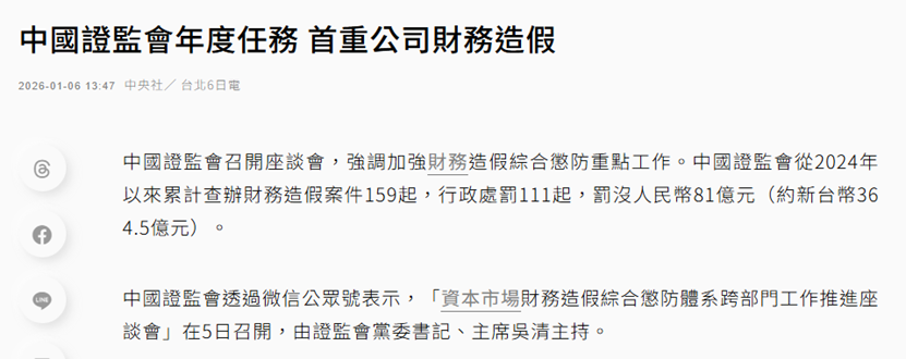 《联合早报》对此发文称,中国证监会此前召开座谈会,强调加强财务造假综合惩防重点工作时提到,2024年7月5日中国国务院办公厅转发中国证监会等部门“关于进一步做好资本市场财务造假综合惩防工作的意见”以来,持续加大对于财务造假案件查处力道,惩治第三方配合造假、压实中介机构“看门人”责任,完善常态化、长效化惩防机制。