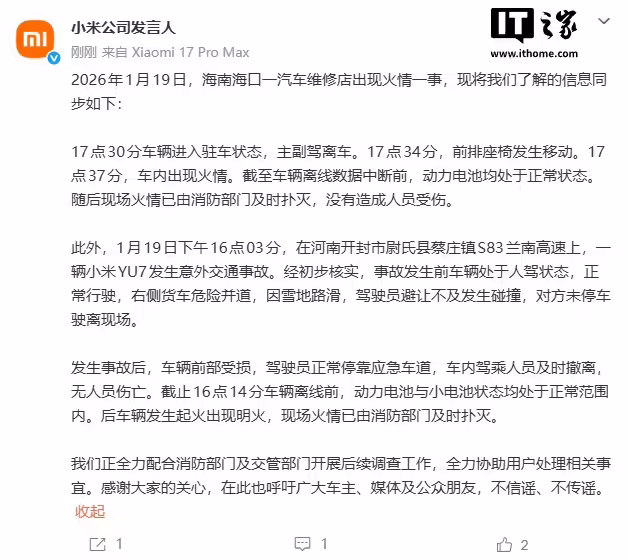 小米公司发言人刚刚发文,就 1 月 19 日海南海口一汽车维修店出现火情一事、1 月 19 日兰南高速的小米 YU7 交通事故进行了回应。
