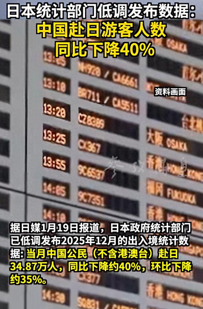 据日媒1月19日报道,日本政府统计部门已低调发布2025年12月的出入境统计数据: 当月中国公民(不含港澳台)赴日34.87万人,同比下降约40%,环比下降约35%。