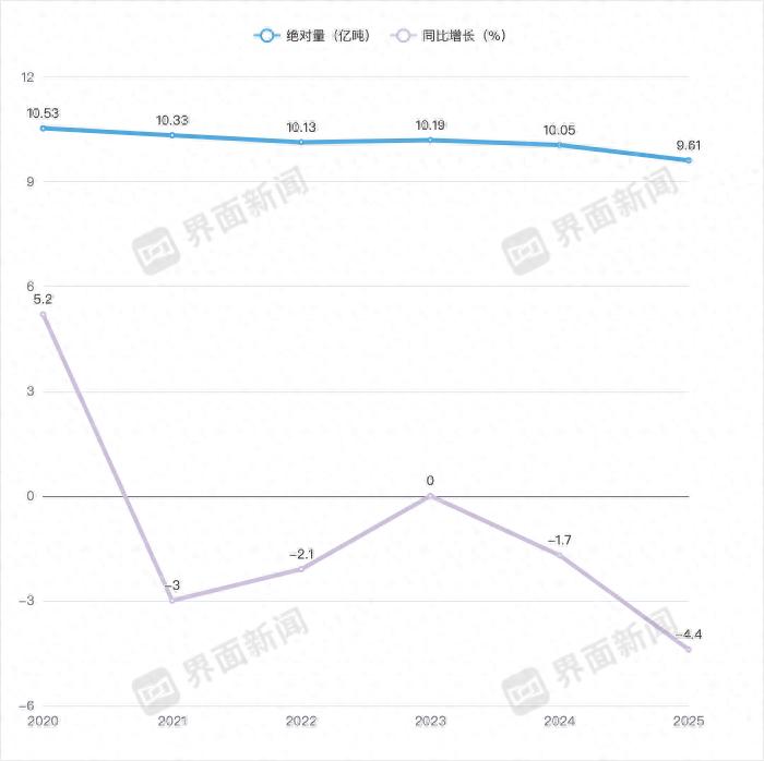 2020-2025年,中国年粗钢产量累降9219万吨。