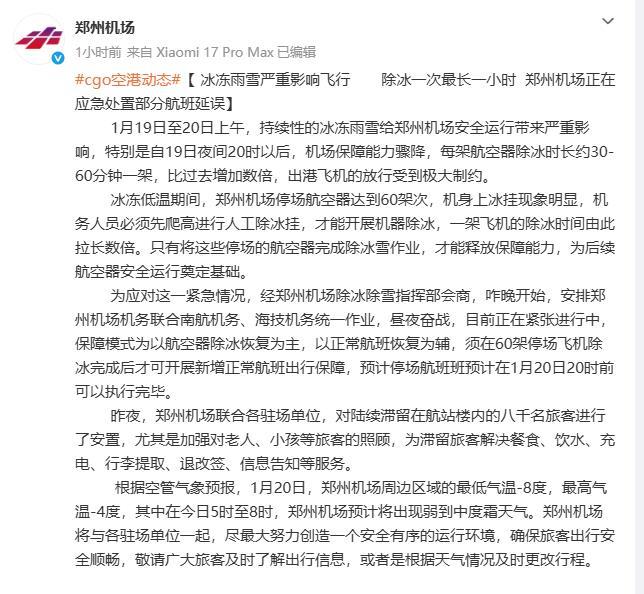 20日一早,郑州机场发布信息称,1月19日至20日上午,持续性的冰冻雨雪给郑州机场安全运行带来严重影响,特别是自19日夜间20时以后,机场保障能力骤降,每架航空器除冰时长约30-60分钟,比过去增加数倍,出港飞机的放行受到极大制约。