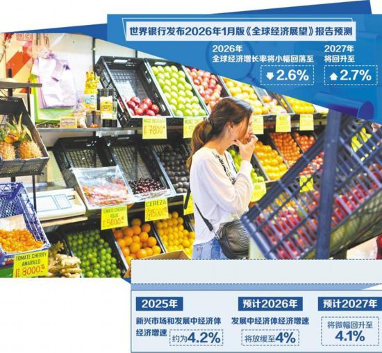 日前,世界银行发布的2026年1月版《全球经济展望》报告指出,尽管贸易紧张局势与政策不确定性持续存在,全球经济的韧性仍超出预期。报告预计,2026年全球经济增长率将小幅回落至2.6%,2027年将回升至2.7%。全球经济展现韧性,但增长动能正在减弱。