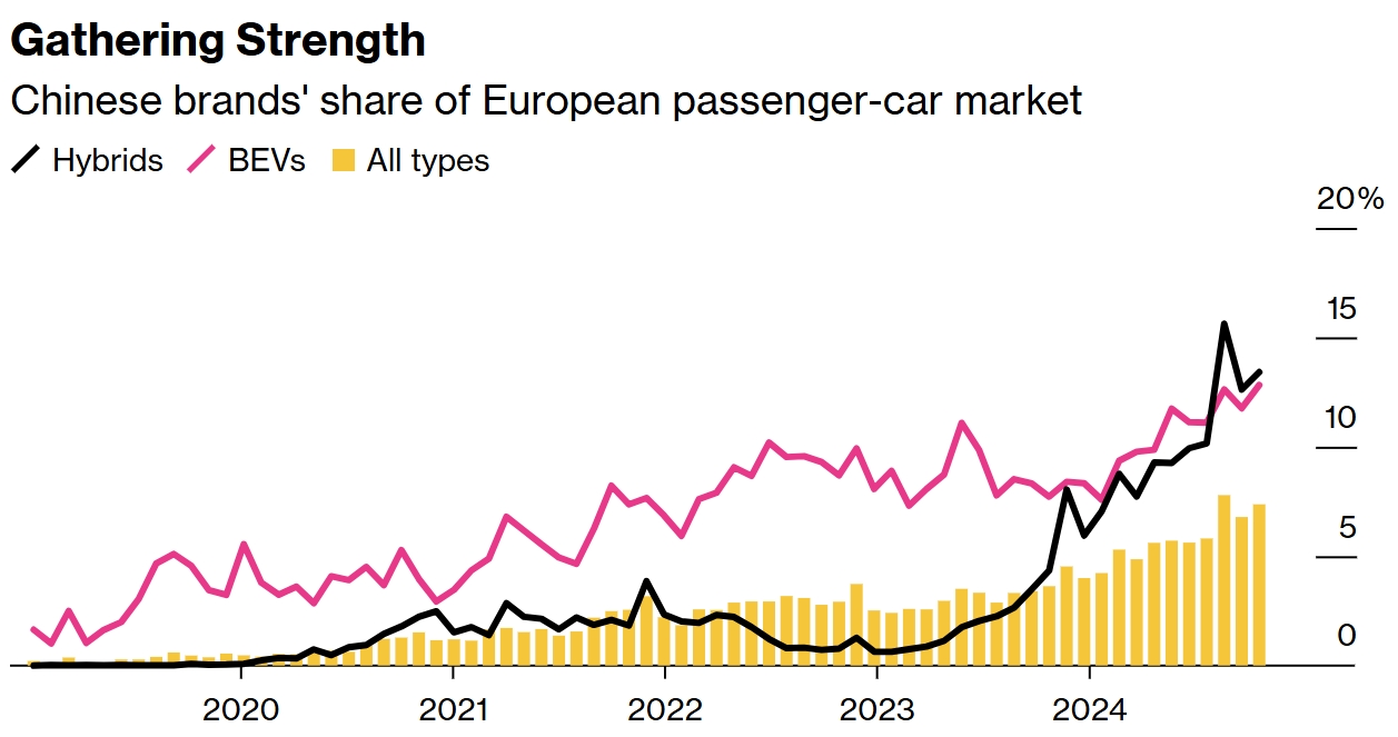 中国品牌在欧洲乘用车市场的份额:混合动力汽车、纯电动汽车、全品类车型 彭博社制图