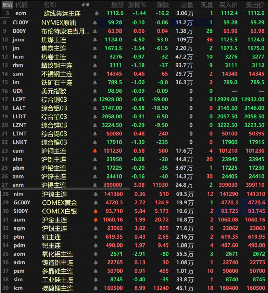 此外,碳酸锂主连临近收盘以8.99%的涨幅涨停封板,报160500元/吨。多晶硅涨0.91%,工业硅跌0.4%。欧线集运主连跌1.44%报1112.6。