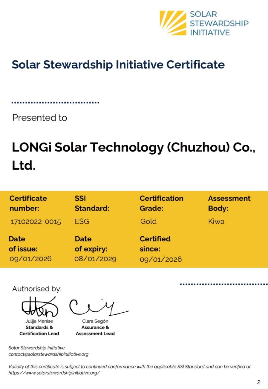 隆基绿能副总裁佘海峰表示:“获得SSI-ESG金牌认证,是对我们可持续发展实践的国际认可,也彰显了我们对欧洲客户核心价值的承诺——即提供可信赖的绿色产品。我们将持续以技术创新驱动,为欧洲客户提供高效、低碳足迹的光伏解决方案,助力降低能源转型成本、提升能源自主性,并携手加速碳中和进程,共同迈向可持续未来。”