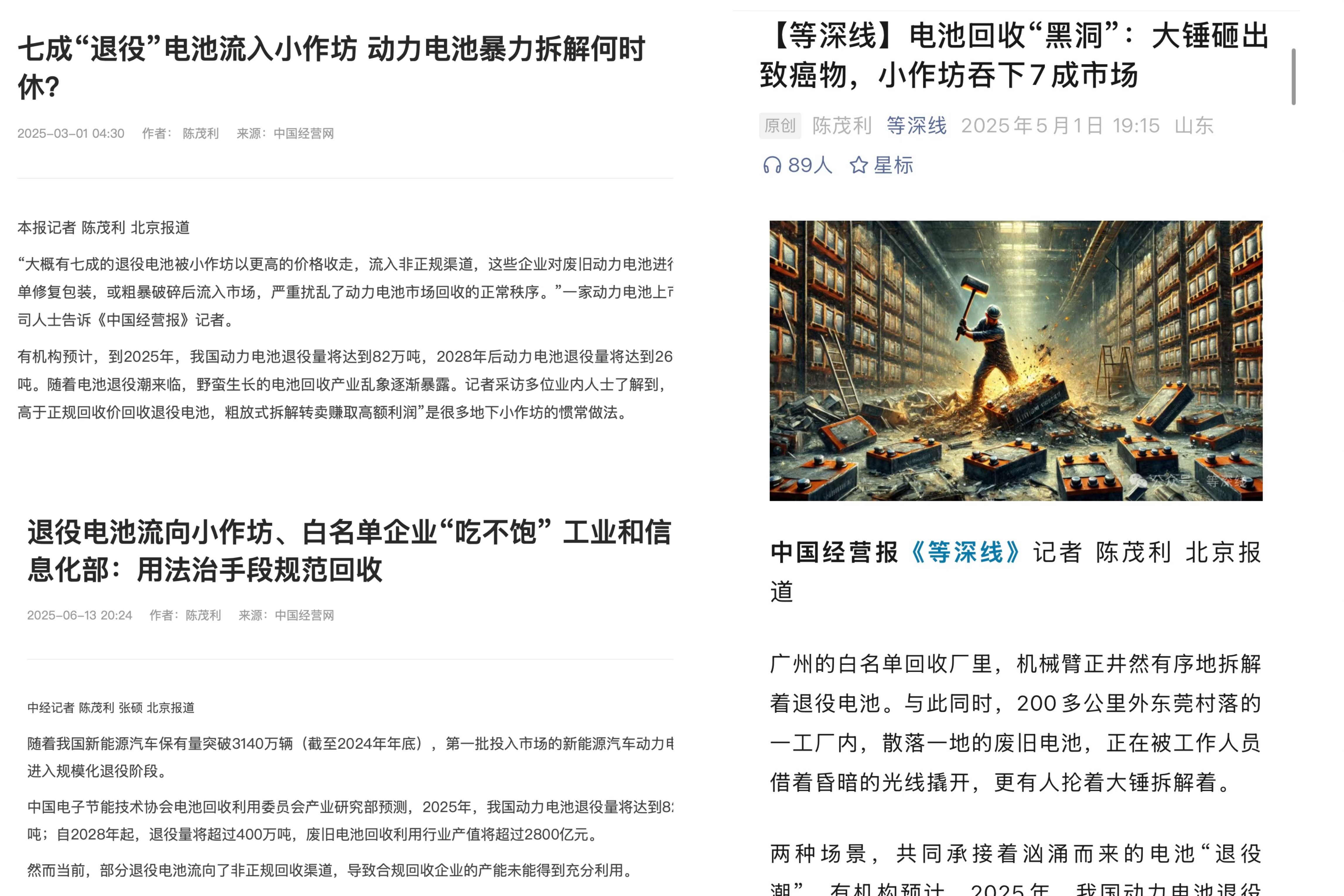 《中国经营报》记者就动力电池回收市场存在的乱象进行调查,相继刊发了多篇报道
