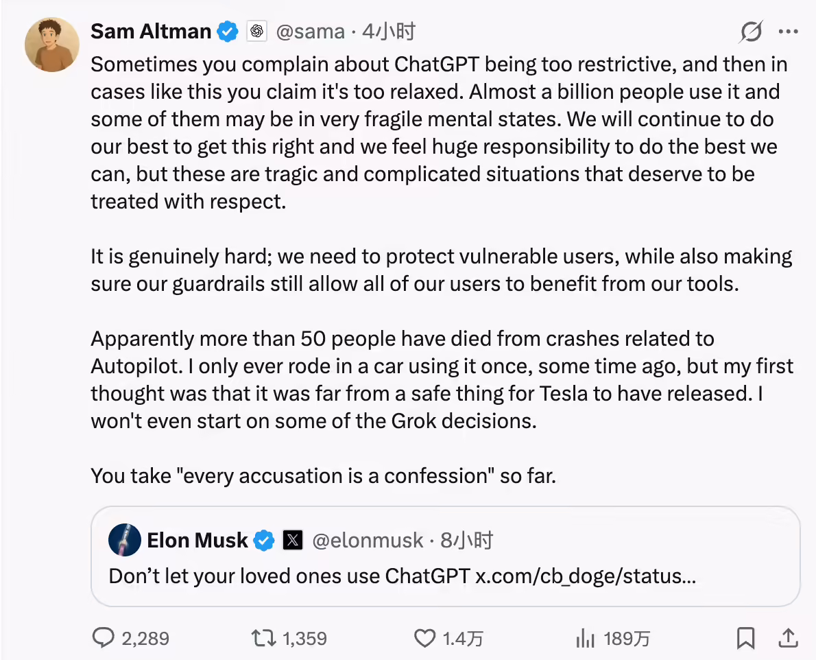 奥尔特曼随即回击,先是捍卫 ChatGPT 及 OpenAI 保护用户的初衷,继而抨击特斯拉的自动辅助驾驶技术 (Autopilot),称其不安全。