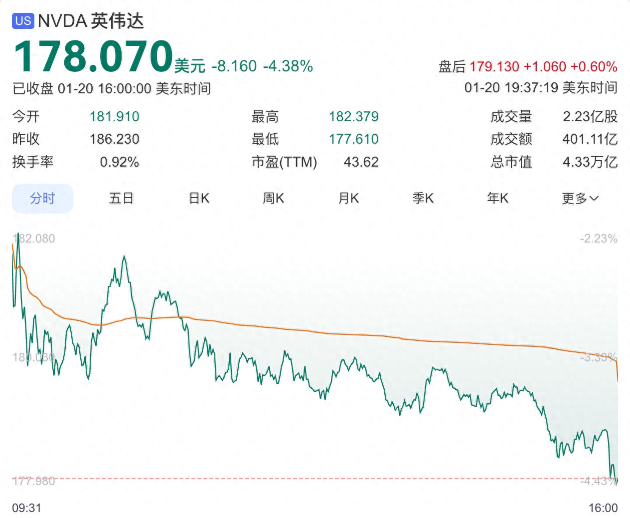 美东时间1月20日,人工智能芯片巨头英伟达(NASDAQ: NVDA)股价遭遇大幅回调,昨晚公司股价跳空低开2.41%,盘中一路低走,截止收盘,英伟达股价报178.07美元,较前一交易日下跌8.16美元,跌幅达4.38%,单日成交额401亿美元,成交量2.23亿股。按收盘价计算,公司总市值缩水至4.33万亿美元,较前一日蒸发约1900亿美元,折合人民币近1.3万亿元,创下近两个月来最大单日跌幅。
