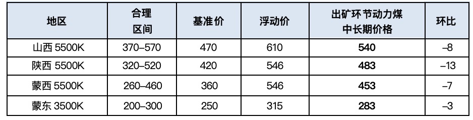 出矿环节长协价同样呈环比下行态势。其中,山西5500大卡动力煤出矿长协价为540元/吨,环比降8元;陕西5500大卡为483元/吨,环比降13元;蒙西5500大卡和蒙东3500大卡分别降至453元/吨、283元/吨,环比各降7元、3元,均处于各地区合理价格区间内。