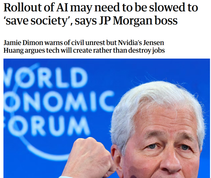 但据《卫报》近日发文称,摩根大通CEO杰米·戴蒙也在瑞士达沃斯世界经济论坛上表示,随着人工智能的推出,这家华尔街金融机构在五年后可能会有更少的员工。他还提到:“如果它对社会进展过快,政府和企业需要以协作的方式共同介入,找到一种重新培训人员并逐渐过渡的方法。”