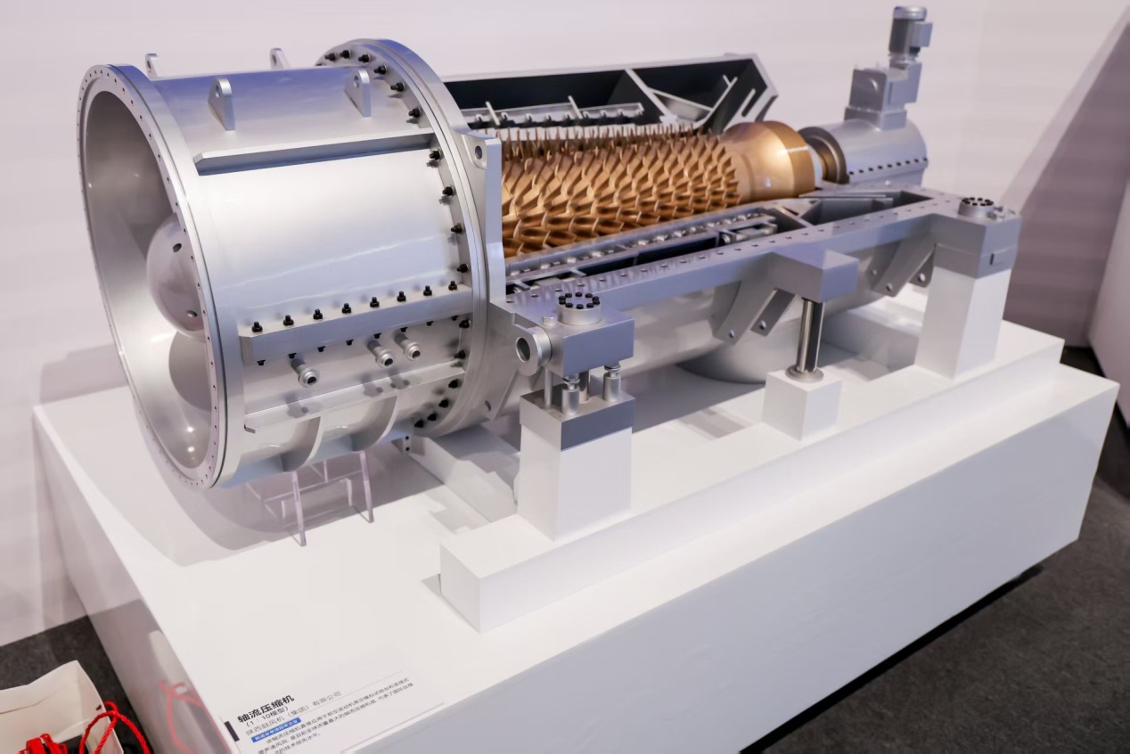 一台精密的银色机械模型吸引了众多专业观众的目光。这是陕鼓研制的AV140轴流压缩机模型。作为我国自主研制的目前全球流量最大的轴流压缩机组,代表了该领域国际领先技术水平。该设备转子直径达1.4米,整机总重400吨,最大风量可达20000立方米/分钟,转换效率超过92%。
