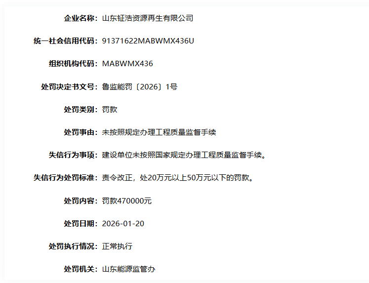 近日,国家能源局资质和信用信息系统处罚信息显示,山东钲浩资源再生有限公司因未按照规定办理工程质量监督手续,被山东能源监管办罚款47万元。