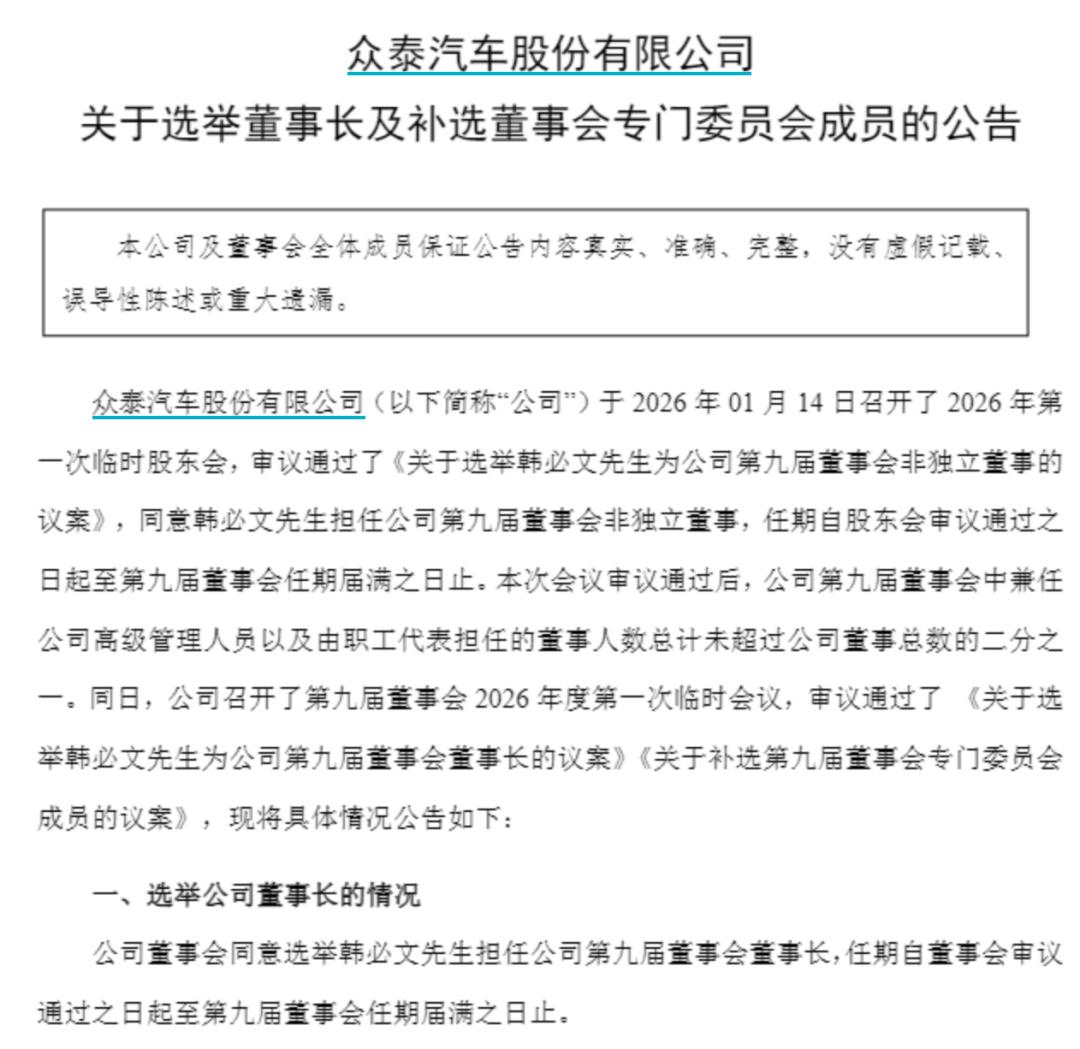 2026年1月15日,公司董事会选举韩必文为第九届董事会董事长。1978年出生的韩必文此前有20多年职业生涯在奇瑞度过,2025年11月28日被聘为众泰汽车的总裁。