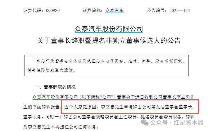 去年12月29日,众泰汽车董事长李立忠因个人家庭原因申请辞去董事长、董事职务,同时辞去董事会战略委员会主任委员、提名委员会委员职务。当时,李立忠担任众泰汽车董事长仅两个月时间。
