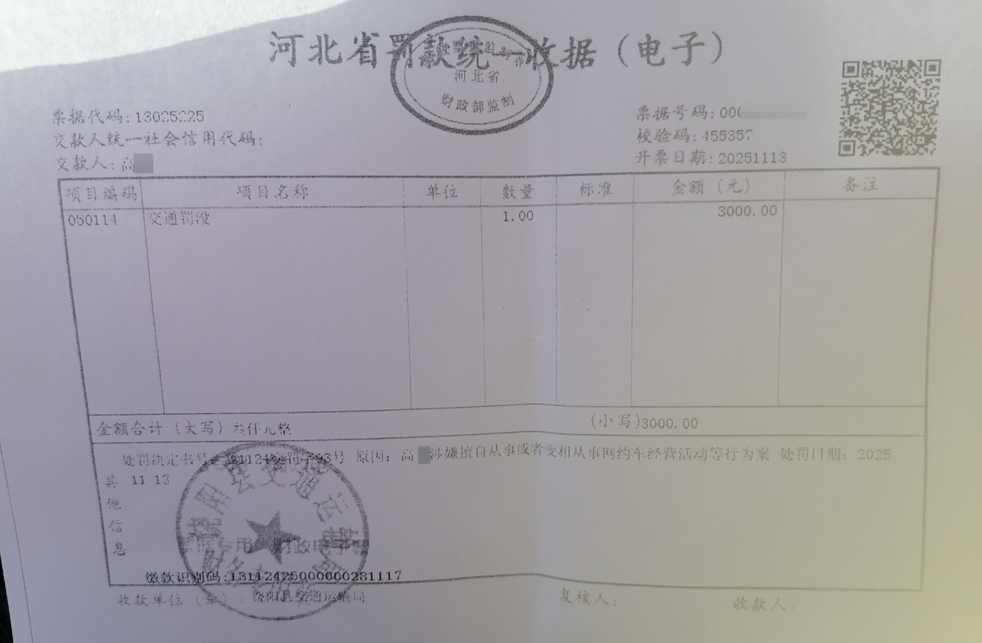 高某表示,2025年11月12日,其因工作事宜前往饶阳县,返程时想着空车返程浪费油费,便打开阳光出行App尝试接单,很快接到一单前往饶阳火车站的订单。当他刚停好车,一名乘客上车、另一名尚未上车时,被当地运管执法人员截查。执法人员询问其是否持有双证,高某如实告知没有,随后车辆被执法人员开至交通局。次日,高某前往当地交通部门,按要求扫码缴纳了3000元罚款。