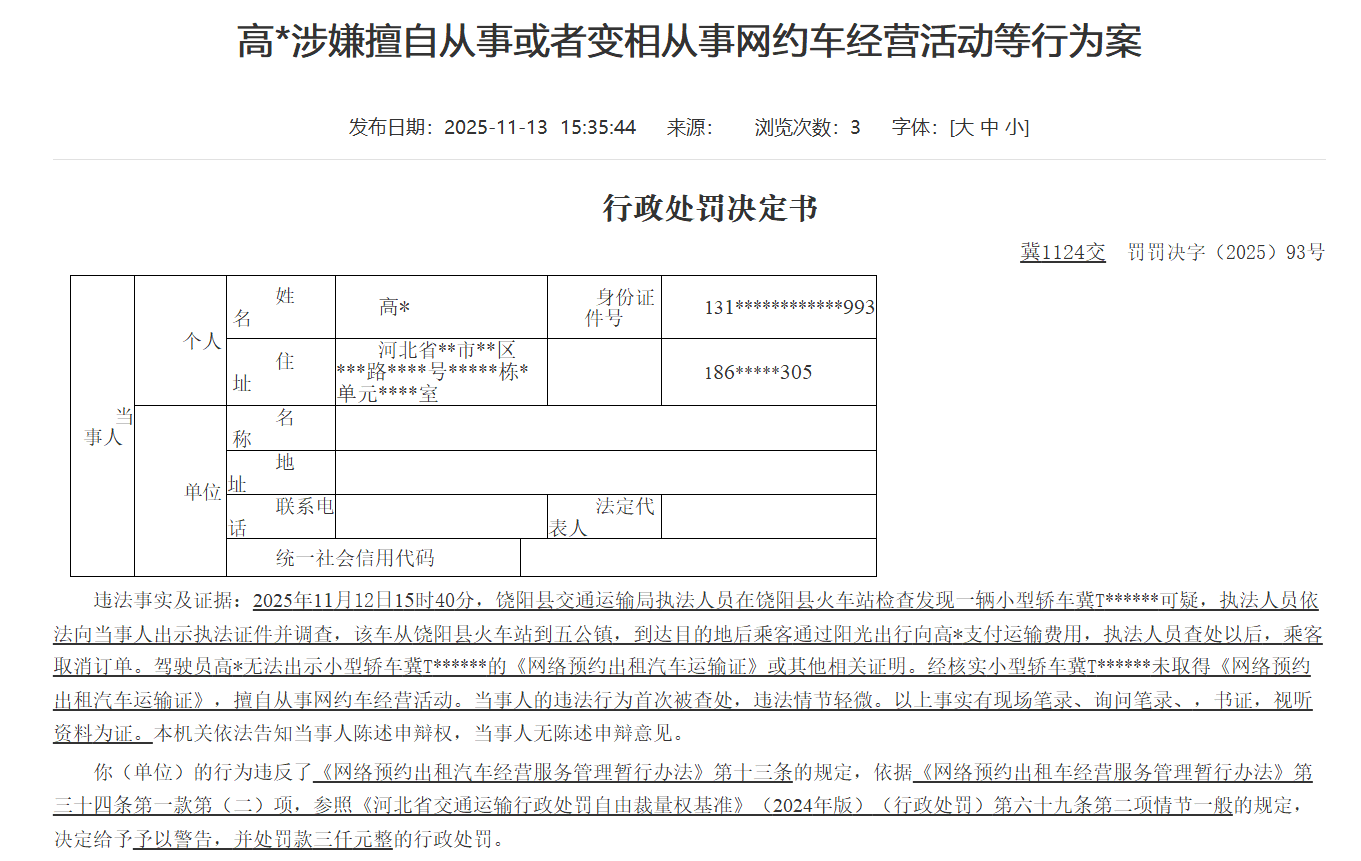 2025年11月12日,兼职网约车司机高某通过阳光出行App在河北饶阳县接单时,因未取得网约车双证(即《网络预约出租汽车驾驶员证》和《网络预约出租汽车运输证》),被饶阳县交通运输局罚款3000元。