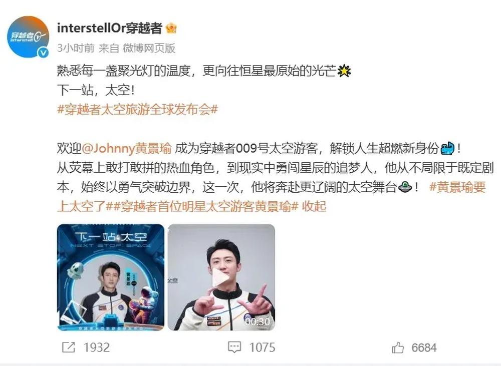 1月22日,@interstellOr穿越者 官宣@Johnny黄景瑜 成为009号太空游客,黄景瑜在vcr中表示很荣幸成为一名太空旅客,将乘坐中国人自己的飞船亲身抵达那片星海。