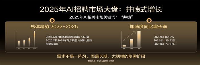 据介绍,BOSS直聘上AI相关岗位的月均新发职位数同比增速呈现出明显的上扬曲线。2023年为8.5%,2024年为36.5%,2025年则达到74.1%。