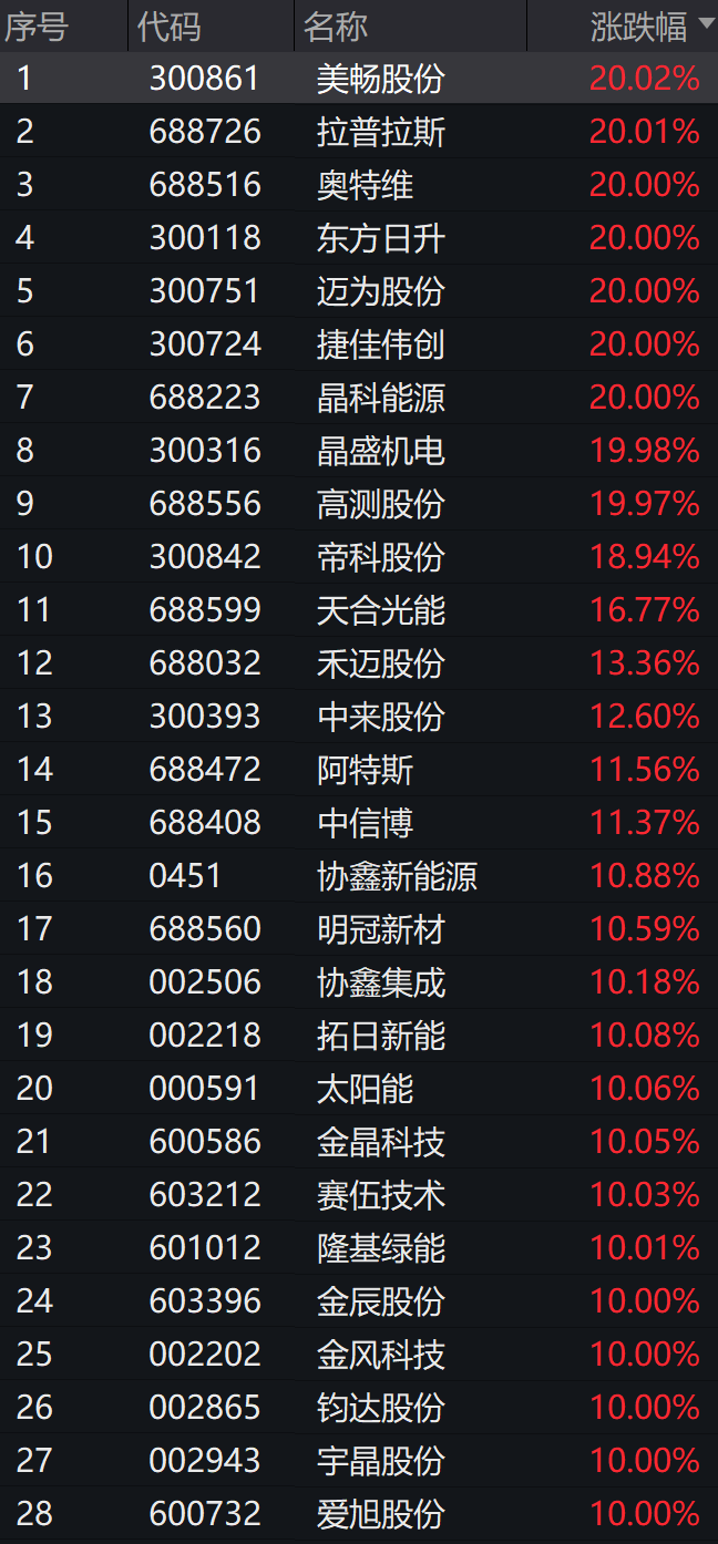 具体而言,美畅股份(300861.SZ)、拉普拉斯(688726.SH)、奥特维(688516.SH)、东方日升(300118.SZ)、迈为股份(300751.SZ)、捷佳伟创(300724.SZ)、晶科能源(688223.SH)、高测股份(688556.SH)等科创板以及创业板光伏公司股价涨停,涨幅高达20%;协鑫集成(002506.SZ)、拓日新能(002218.SZ)、隆基绿能(601012.SH)、爱旭股份(600732.SH)、钧达股份(002865.SZ)等多只沪深主板光伏公司同样涨停,涨幅为10%。