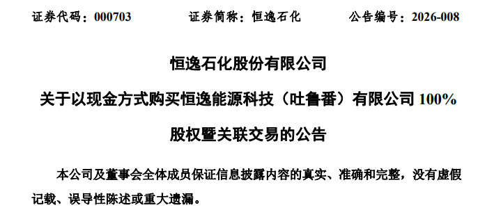 1月22日,恒逸石化(000703)发布公告,公司全资子公司恒逸有限拟以现金方式购买恒逸能源科技(吐鲁番)有限公司100%股权,交易总价款为5亿元,增值率为0.33%。交易完成后,恒逸石化将通过全资子公司间接持有恒逸能源科技(吐鲁番)100%股权。