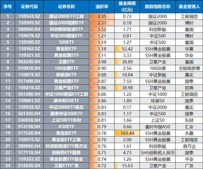 注:目前溢价率在0.7%以上的股票型ETF(基金规模截至1月22日,其余数据截至1月23日,剔除光伏系ETF)