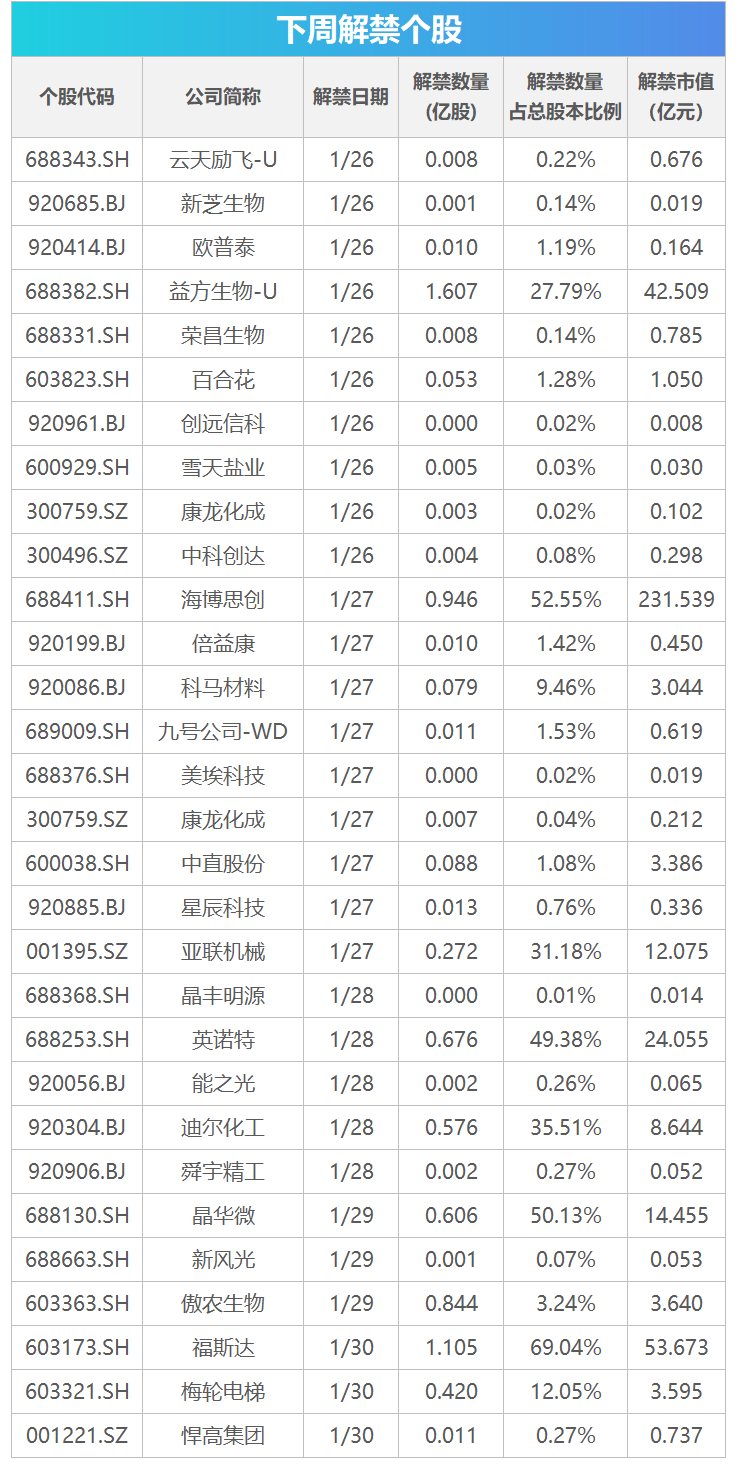 从解禁市值来看,1月27日是解禁高峰期。按1月23日收盘价计算,解禁市值居前三位的是:海博思创(231.54亿元)、福斯达(53.67亿元)、益方生物-U(42.51亿元)。从个股的解禁量看,解禁股数居前三位的是:益方生物-U(1.61亿股)、福斯达(1.11亿股)、海博思创(0.95亿股)。