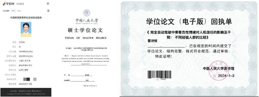 同时,雷诗情硕士学位论文为《完全自动驾驶中乘客负性情绪对人机信任的影响:不同经验人群的比较》,指导老师为齐玥(中国人民大学心理学系副教授)。