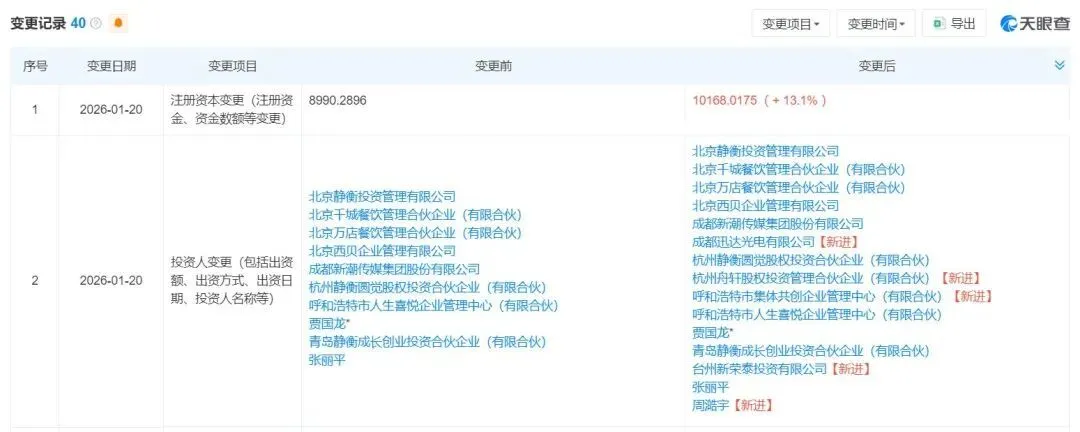 遭遇关店风波后,西贝近日获得新一轮融资。天眼查显示,投资方包括台州新荣泰投资有限公司、呼和浩特市集体共创企业管理中心(有限合伙)、成都迅达光电有限公司、杭州舟轩股权投资管理合伙企业(有限合伙)等。工商信息显示,西贝餐饮的注册资本从8990.29万元增至1.02亿元,增幅约13%。