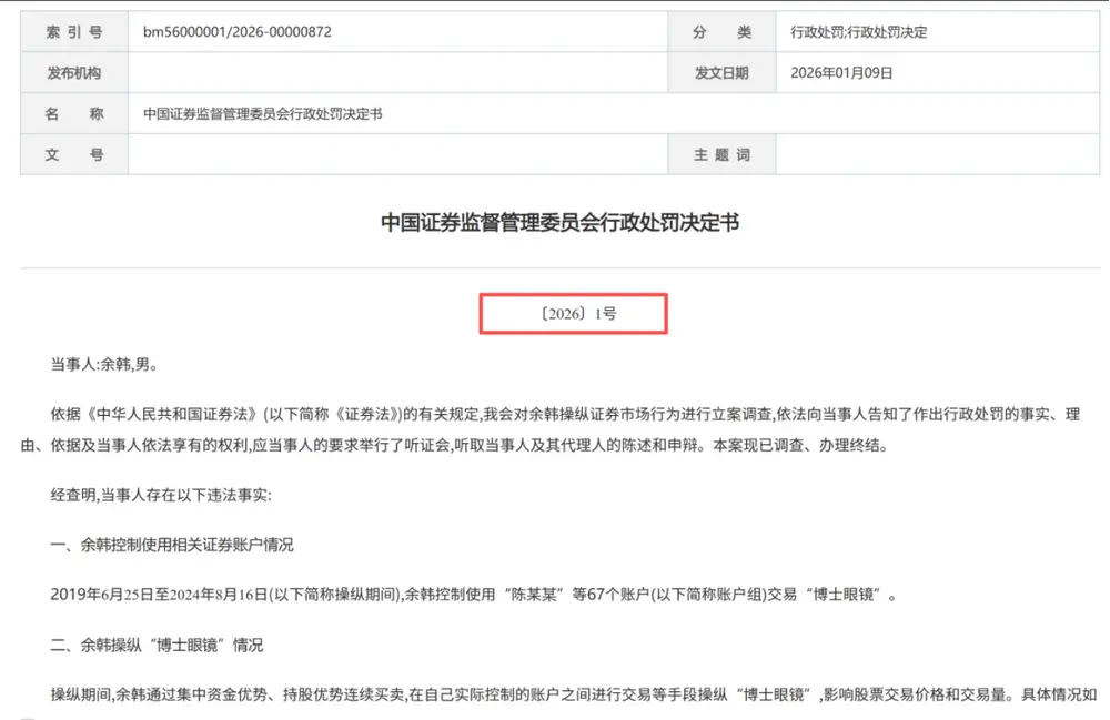作为年度标志性案件,证监会的“1号罚单”直指长期股价操纵行为。1月23日,中国证监会下发行政处罚决定书,判定当事人余韩存在以下违法事实: