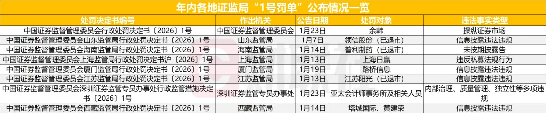 据财联社记者不完全统计,截至1月25日,中国证监会及山东、海南、上海、厦门、江苏、深圳、西藏等各地证监局已陆续公布合计八张2026年度“1号罚单”。