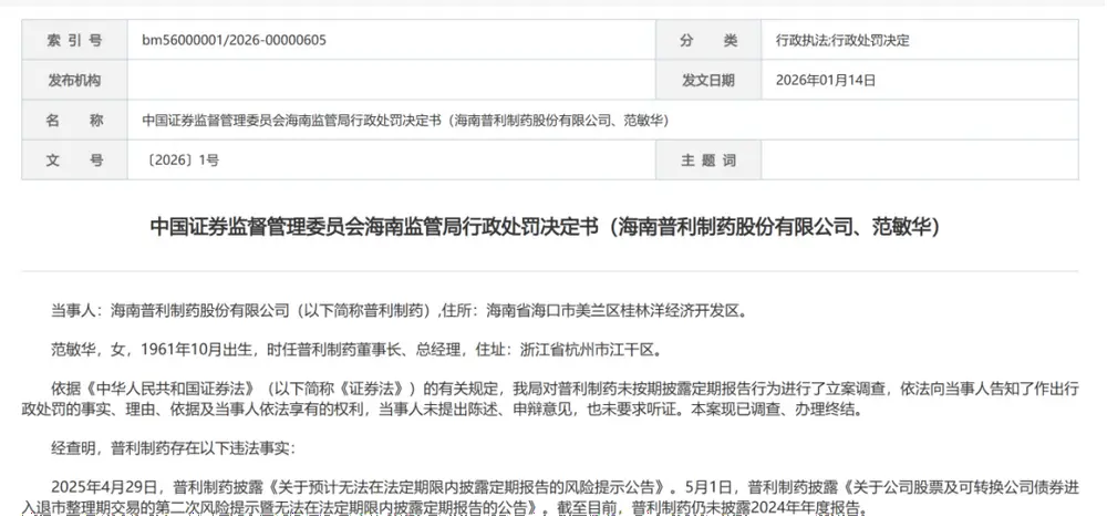 1月14日,海南监管局的“1号罚单”显示,创业板退市公司海南普利制药股份有限公司(以下简称“普利制药”)未在法定期限内披露2024年年度报告,时任董事长兼总经理范敏华未能勤勉尽责,对上述违规行为负有直接责任。