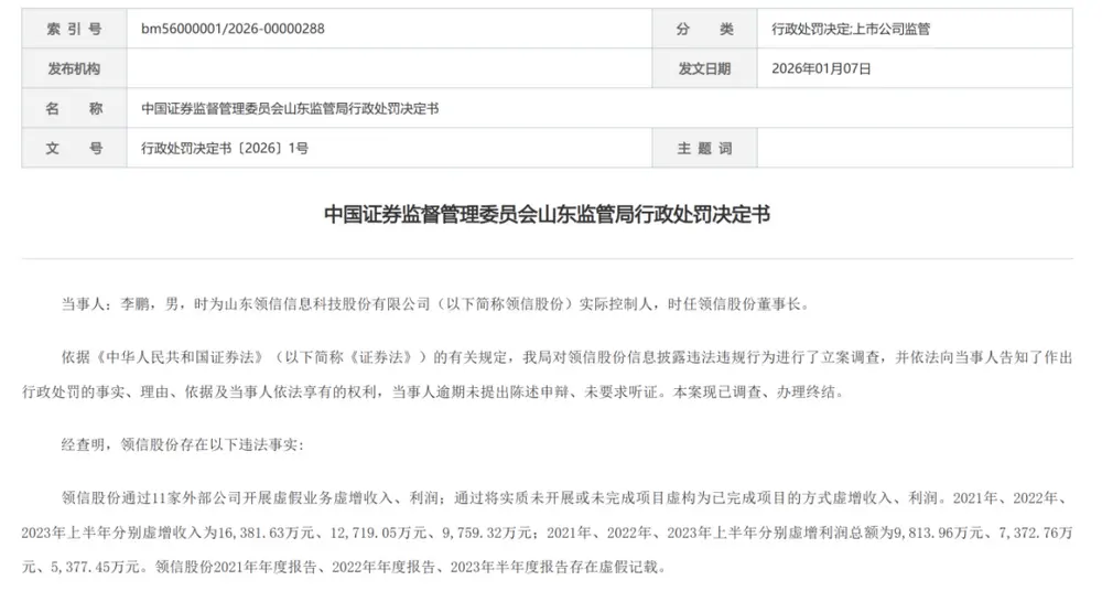 1月7日,山东证监局公布2026年“1号罚单”。北交所退市公司山东领信信息科技股份有限公司(以下简称“领信股份”)在2021年、2022年及2023年上半年,通过11家外部公司开展虚假业务,并将未实际开展或未完成的项目虚构为已完成,大肆虚增收入与利润,存在系统性财务造假及信息披露违法违规行为。