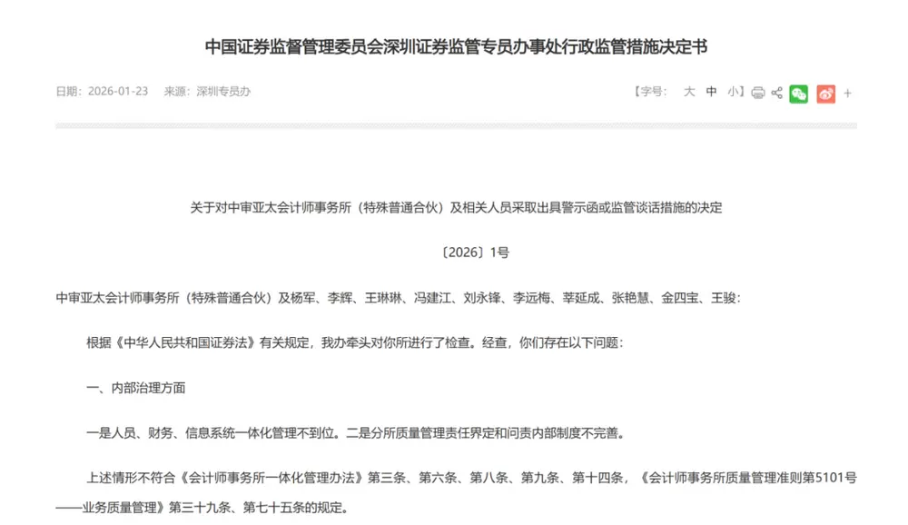 1月23日,深圳证券监管专员办事处发布〔2026〕1号行政监管决定,对中审亚太会计师事务所及相关10名执业人员采取出具警示函或监管谈话措施。