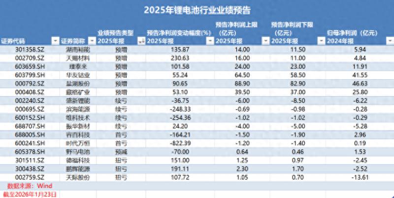 据《华夏时报》记者统计,截至2026年1月23日股市收盘,锂电池行业已有16家上市公司披露2025年业绩预告。这16家公司的主营业务几乎覆盖了整个产业链。2025年,这16家公司的合计净利润至少为208.93亿元,最多为237.73亿元,远高于2024年的110.7亿元。暖风已至,行业似乎走出过往阴霾。其中,天际股份(002759.SZ)因第四季度盈利大增而一举扭亏,1月22日,其董秘办工作人员告诉记者,“去年下半年,储能需求增长导致供应端出现缺口,产品价格上涨。不过,上行周期能持续多久还是取决于需求端。”