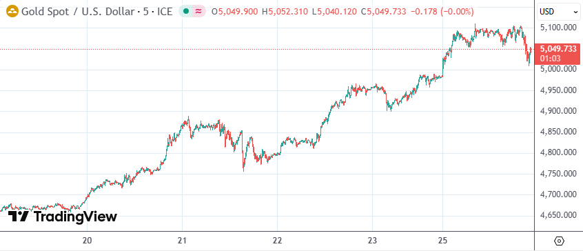 现货黄金日内一度涨2.4%至每盎司5111.17美元,也刷新了历史纪录,发稿时涨幅收窄至1.2%左右,报每盎司5050美元;现货铂金日内一度升至每盎司2918.55美元。