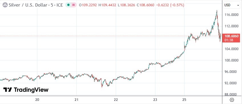 具体行情显示,现货白银价格日内一度涨14%至每盎司117.75美元,与之相比,2025年末时报71.64美元。截至发稿,银价收窄日内涨幅至5%附近,报每盎司108.6美元。