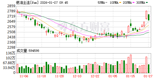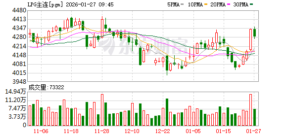 1月26日,国内期货市场上演“能源狂欢”,原油系品种集体上行。其中,LPG期货主力合约表现最为亮眼,单日涨逾4%,领涨整个原油板块;高硫燃料油同样涨逾4%,燃油、低硫燃料油、SC原油等品种涨幅均超2%。外盘方面,近期美国天然气期货2602合约持续暴涨,最近6个交易日累计涨逾100%。国际油价上周涨近3%。