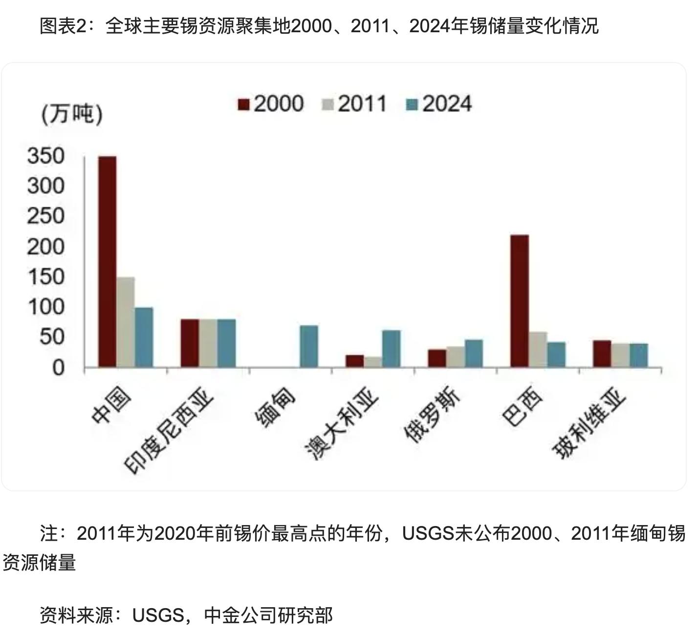 中国是全球最大的锡资源储量国和产量国。从全球资源格局看,锡资源主要分布在中国、印度尼西亚、巴西、玻利维亚、澳大利亚,五国锡储量超过全球总储量的70%。