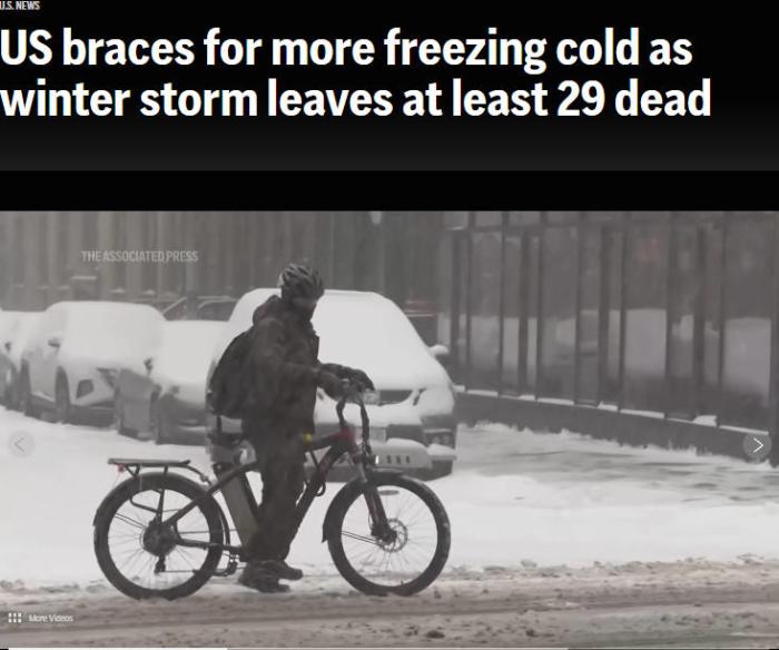 据美联社等美媒报道,近日,一场冬季风暴席卷美国多地,已经造成至少29人死亡。