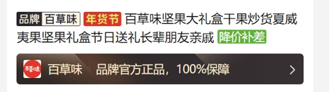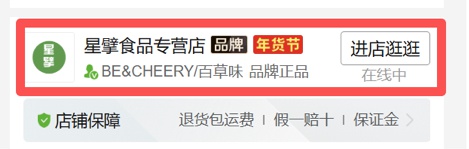 据了解,售卖该涉事礼盒的店铺名叫“星擘食品专卖店”,确实不是百草味官方店铺,但使用了“品牌”黑标、“品牌官方正品,100%保障”等具有误导作用的标识。